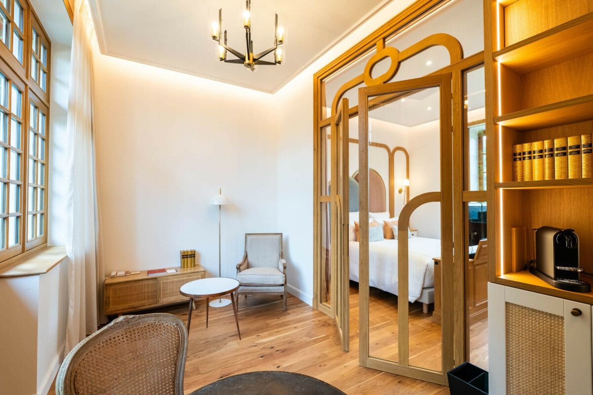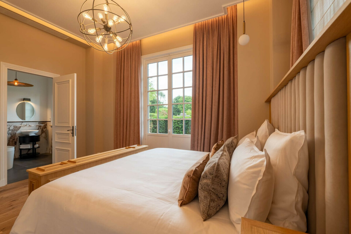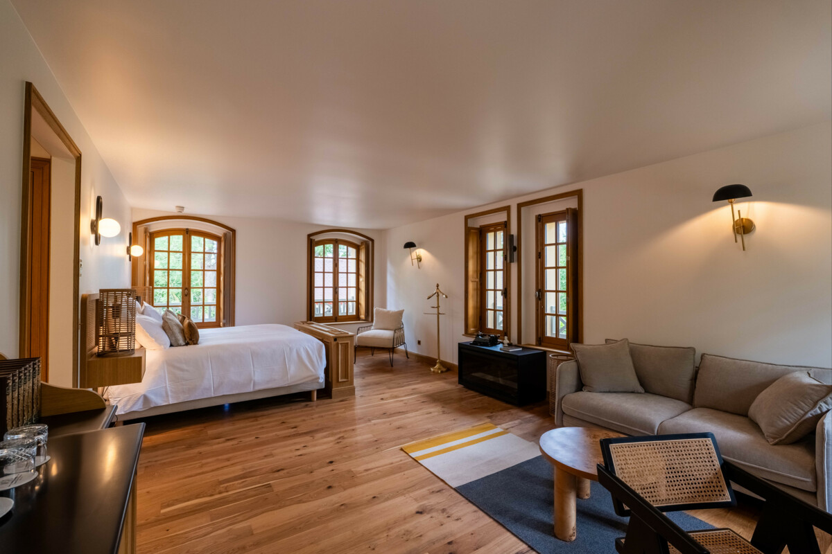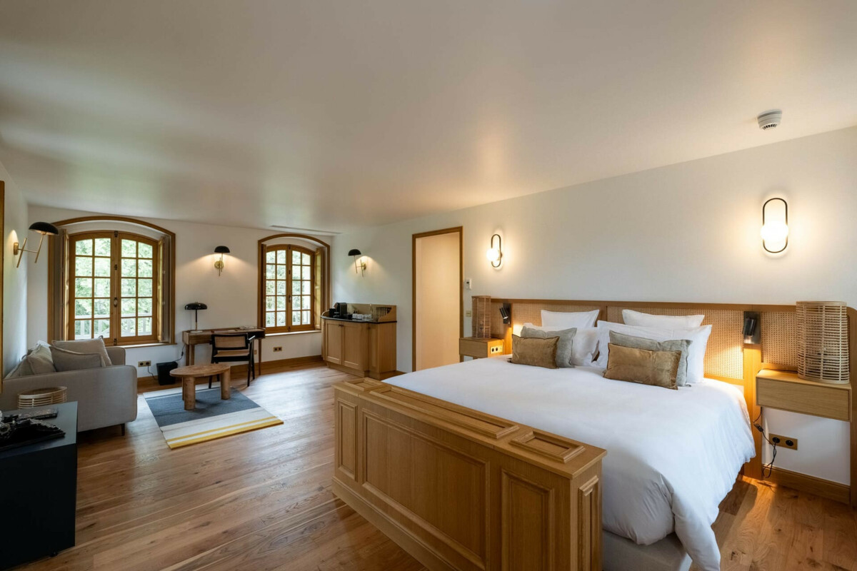 Située dans les anciennes Ecuries, la Suite Parc vous invite à vous ressourcer dans un cadre paisible et verdoyant, avec une vue imprenable sur le parc verdoyant. Élégamment aménagée et dotée de prestations haut de gamme, cette suite vous promet un séjour luxueux et relaxant.