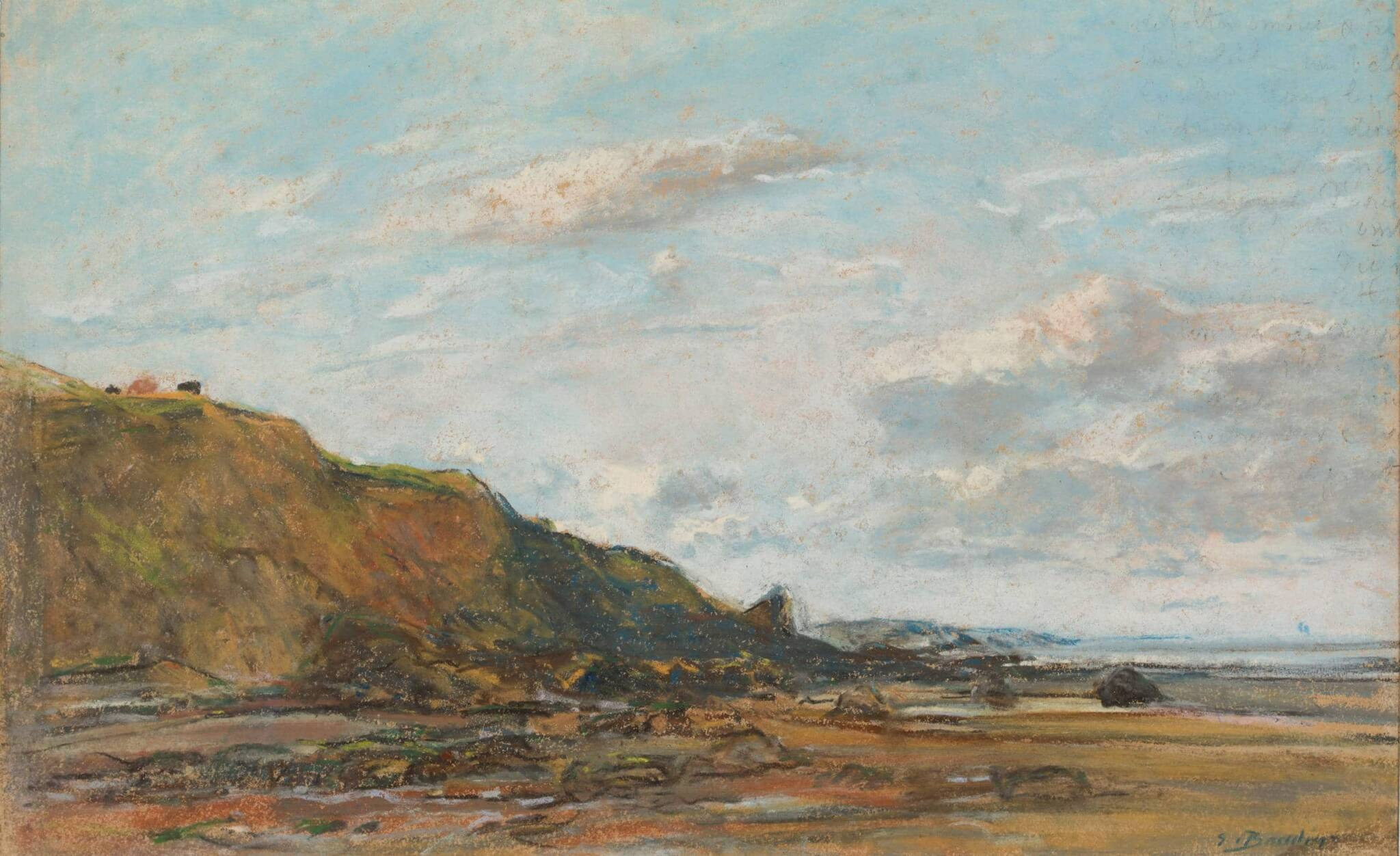 Peintre de marines et de ciels, Eugène Boudin incarne à lui tout seul un site : la Normandie balnéaire. L’artiste a accordé une place importante à l’étude du ciel et des nuages, ainsi qu’à la représentation des masses rocheuses dans lesquelles se devinent, au loin, les imposantes falaises des Vaches Noires. Peintre de plein air, Boudin choisit, avant les impressionnistes, la technique du pastel, matériau souple qui lui permet de fixer rapidement le spectacle mouvant des ciels nuageux.